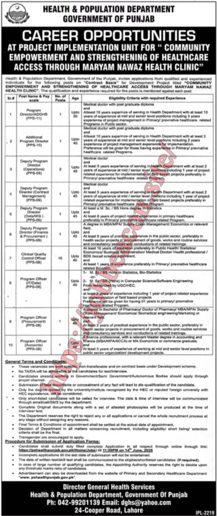 Apply now for Punjab Health Department Jobs 2025 under the Maryam Nawaz Health Clinics project. Multiple vacancies available. Last date: 14 June 2025.
